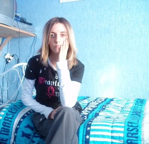 Un débardeur blanc tout simple. Un pull Ralph Lauren blanc avec le logo bleu marine. Un vieux jean, plutôt clair. Des Converse blanches. Coiffée n'importe comment (= je reviens d'une heure d'équitation et j'ressemble à rien.)